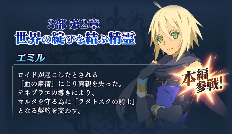メインシナリオ3部第2章の本編にて、「テイルズ オブ シンフォニア -ラタトスクの騎士-」よりエミルが参戦です!