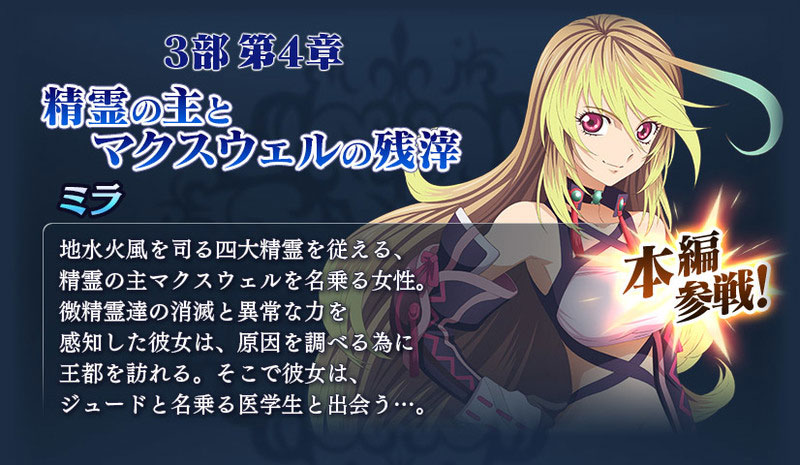 メインシナリオ3部第4章の本編にて、「テイルズ オブ エクシリア」よりミラが参戦です!